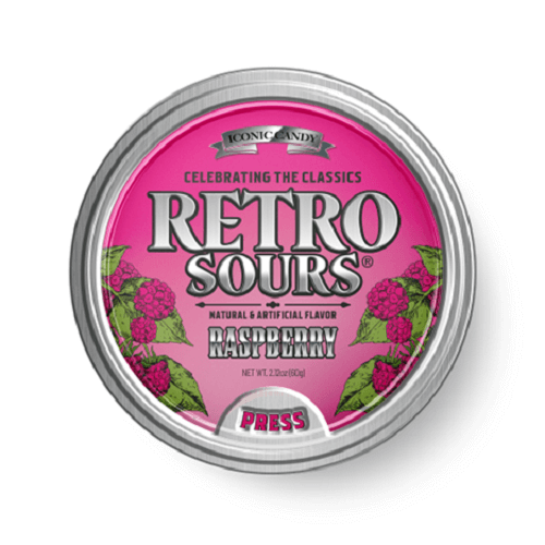Iconic Candy Retro Sours Raspberry Candy Tins a beloved favorite from 90's! Bold raspberry-flavored sour candies, this tin offers the perfect blend of juicy sweetness and tangy sourness. Great for on the go with this resealable tin.